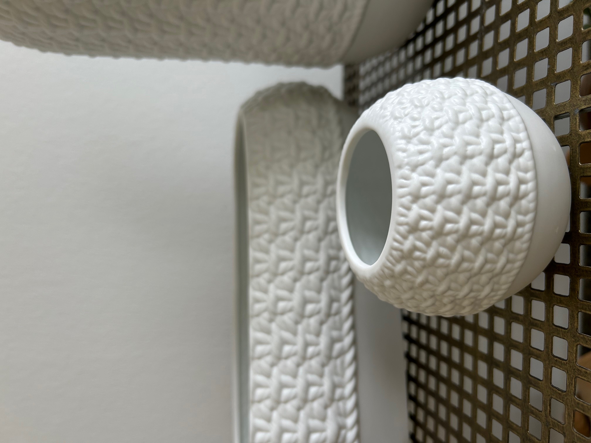 Flot sæt til strikelskeren. Vase, skål og fyrfadsstage er alle i porcelæn med flot præget strikmønster. Klassisk og alligevel personligt til den flittige strikker.