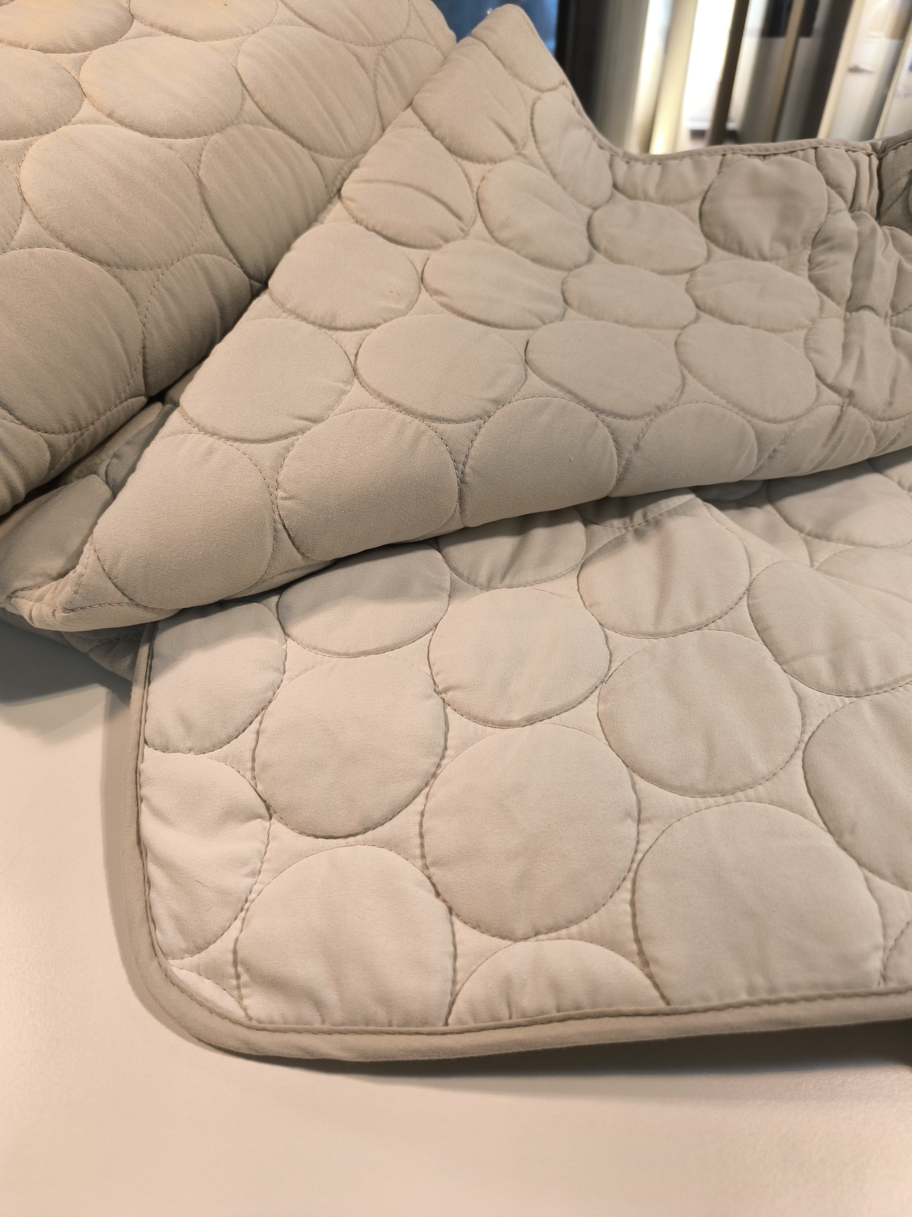 Den har 2 forskelige side, den ene side er beige farvet og den anden side er creamfarvet.