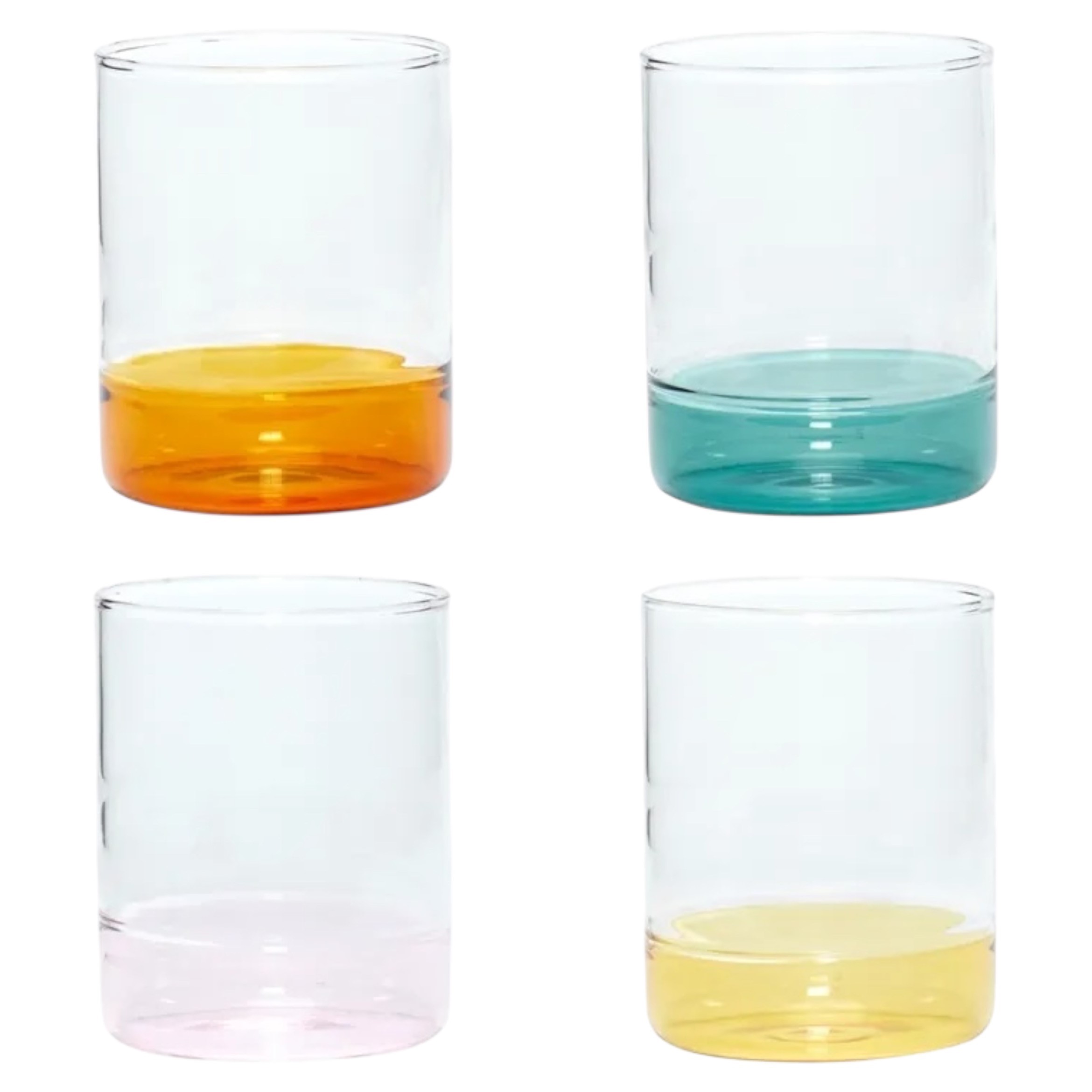 Hübsch Glas Drikkeglas ServiceDisse smukke drikkeglas i klart glas med farvet bund, gør noget godt for enhver bordopdækning. Et strejf af farve er altid godt, når du dækker bordet til din kommende fest, når du får venner på besøg eller til helt almindelig hverdagsbrug.