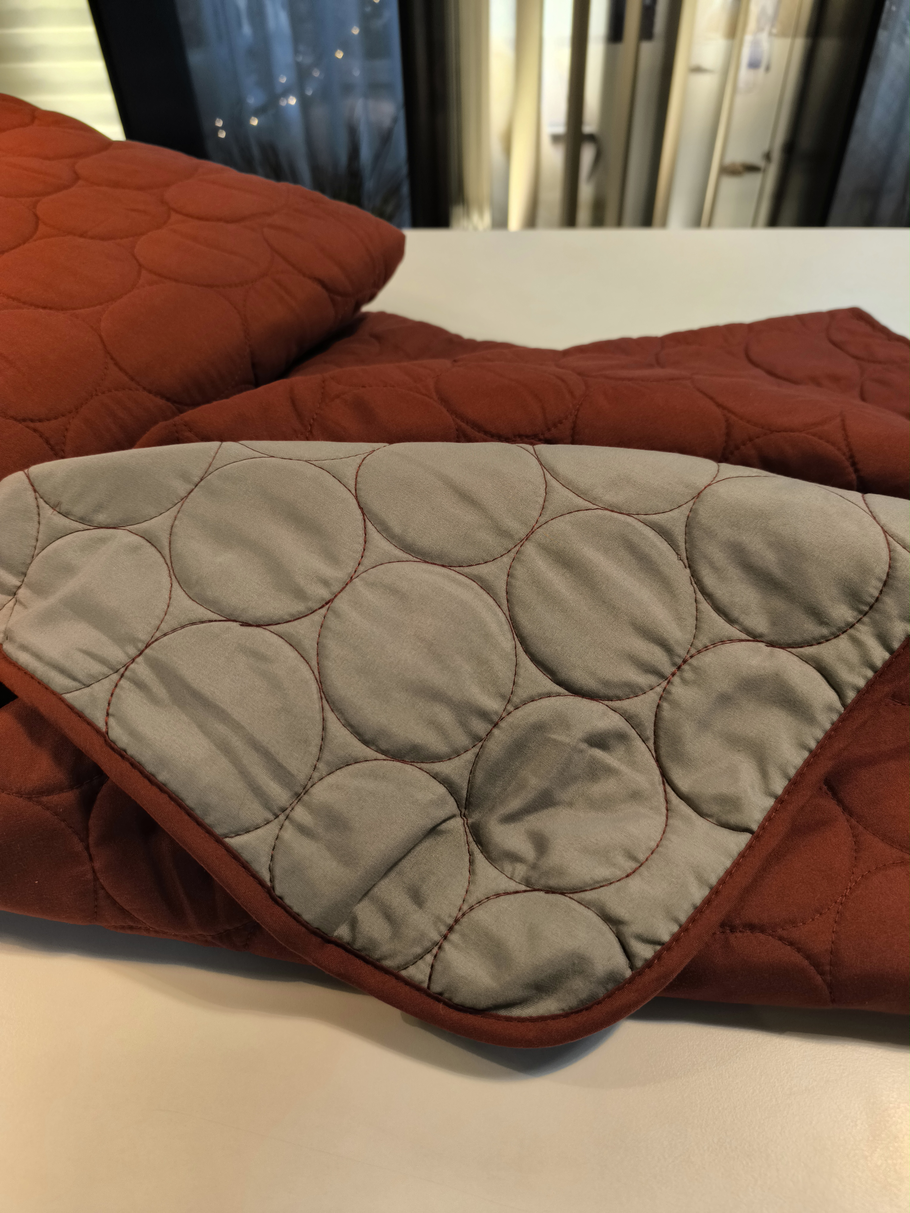 Den har 2 forskelige side, den ene side er vinrød og den anden side er lysgrå.